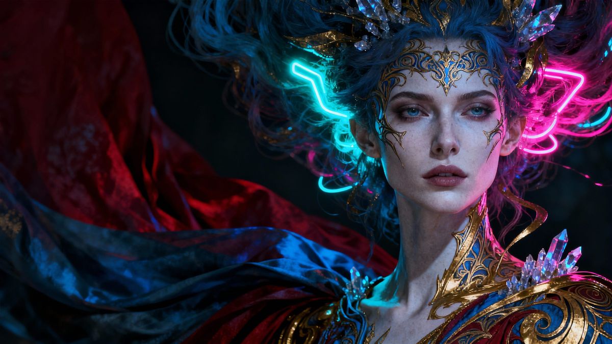 This hyper-realistic portrait features a woman with intricate details, dynamic lighting, and ornate patterns, rendered in a dark fantasy style with vibrant neon highlights.