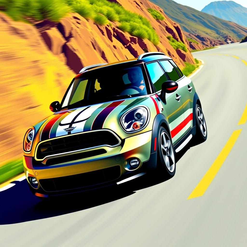 This image shows a sleek 2011 MINI Cooper Countryman sport, painted in a metallic finish, with racing stripes and vibrant colors, evoking a dynamic, high-tech aesthetic reminiscent of classic sci-fi and futuristic design.