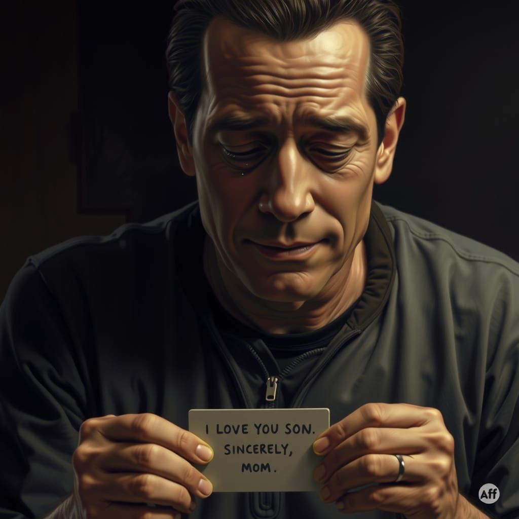 This poignant image depicts a middle-aged man holding a heartfelt photograph and tears, set against a somber background, in a hyperrealist style