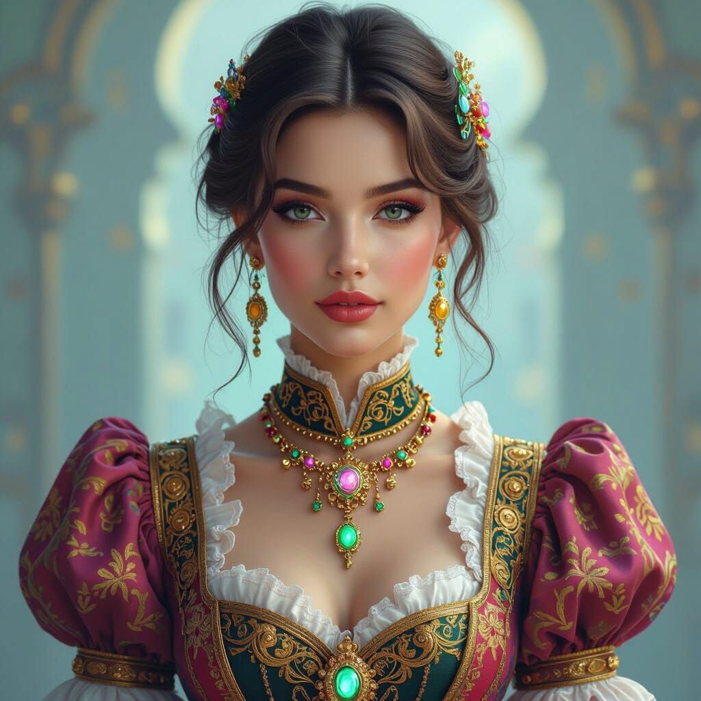 This image shows a beautiful woman in detailed, colorful Victorian-style clothing and futuristic jewelry. The hyperrealistic image features precise textures and subtle lighting, rendered in a digital art style.