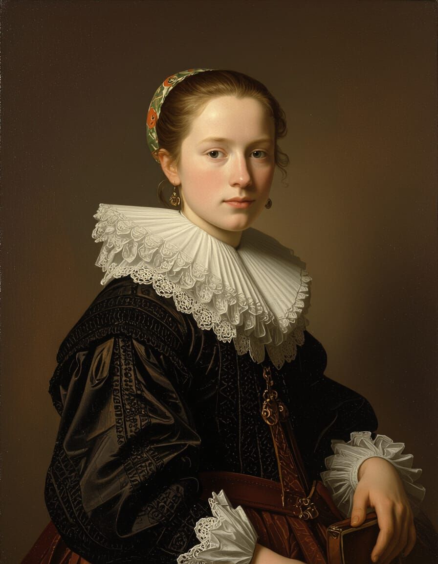 This image shows a stunning portrait of a young Dutch woman in 17th-century attire. The painting evokes a Baroque aesthetic, reminiscent of a Dutch Golden Age masterpiece.