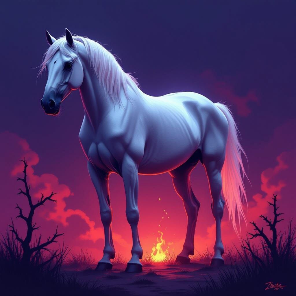This image shows a white horse with its bones painted black to appear as a skeleton, illuminated by dramatic backlighting in a deep purple and orange palette. Created in a dark fantasy concept art style.