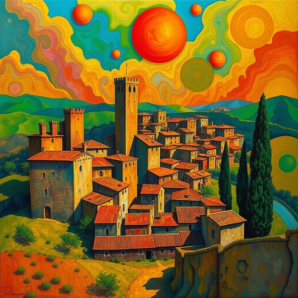 This image shows a fantastical, dreamlike landscape of San Gimignano's medieval towers and fortifications, blending rustic charm with surrealist flair, featuring bold colors and intricate textures.