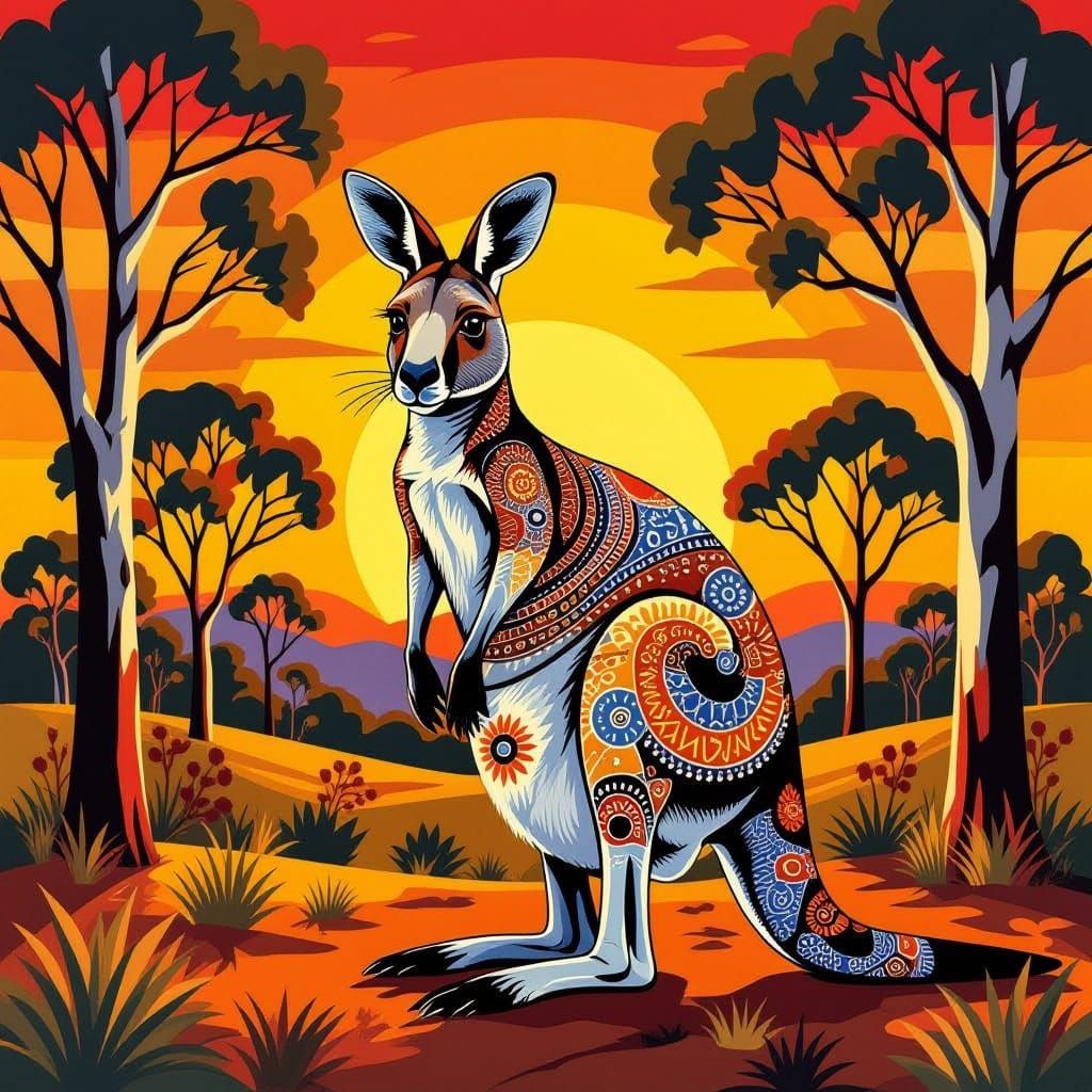 This image depicts a kangaroo adorned with Aboriginal dot art patterns, set against a vibrant sunset landscape with eucalyptus trees, in a folk art style.