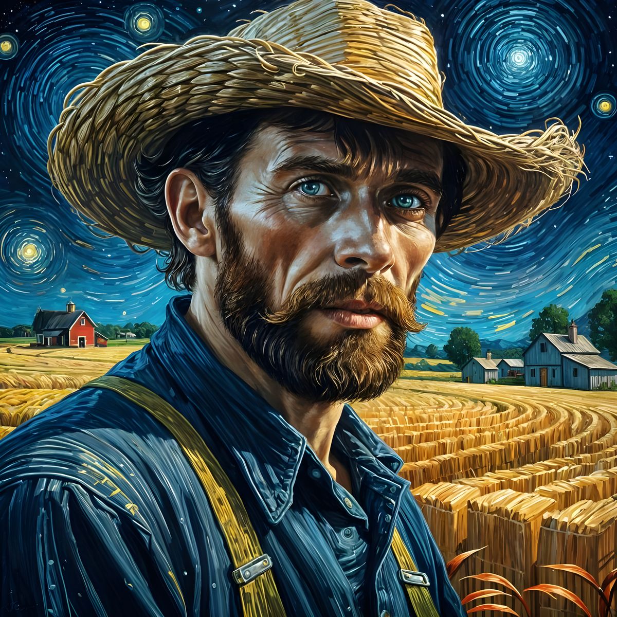 A vibrant painting of Vincent van Gogh as a farmer at night near a farmhouse. The image features luminous water droplets, fireflies, a large moon, and a starry sky, rendered with thick brushstrokes.