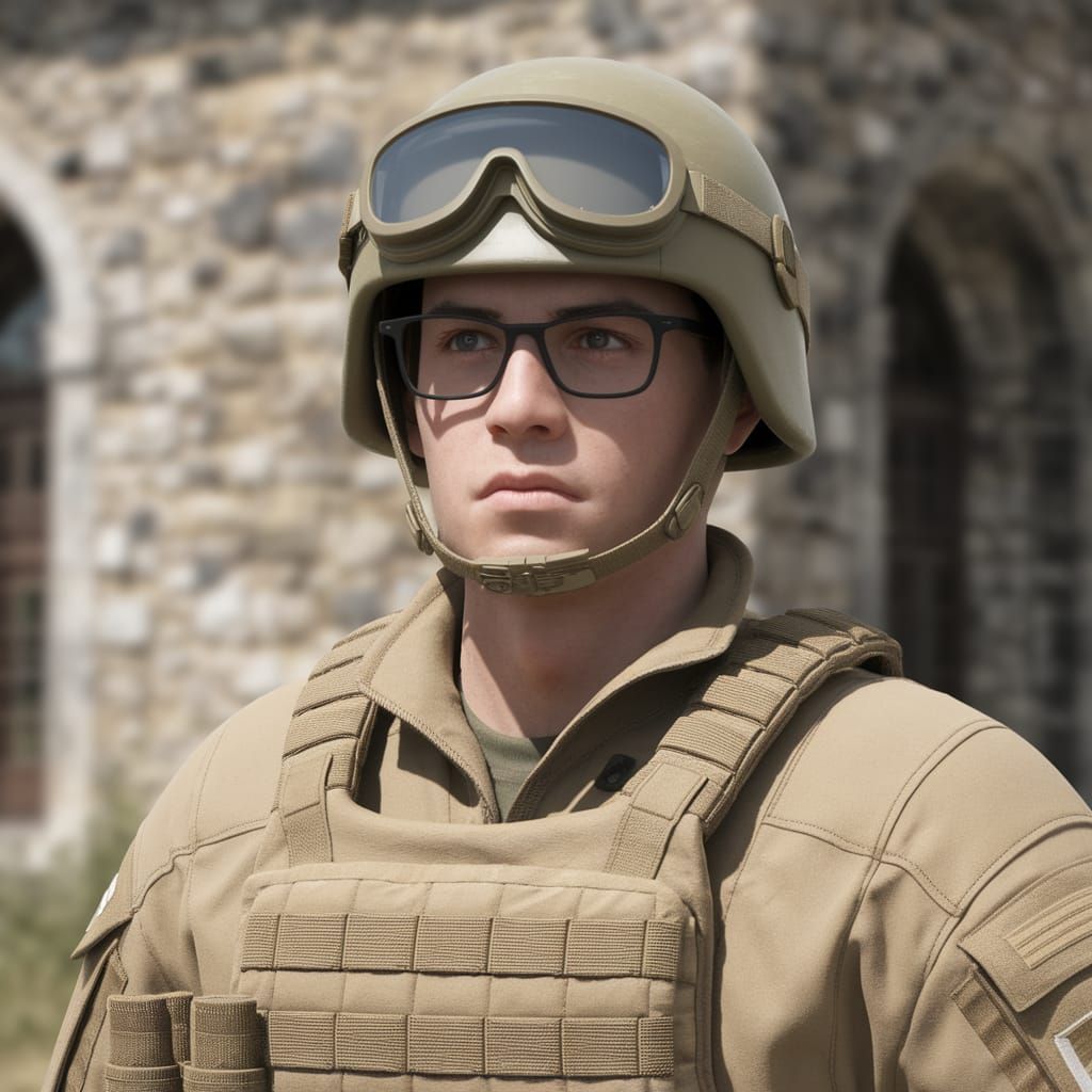 A photorealistic portrait of a young soldier in a military uniform, captured in a muted color palette with a focus on textures and a gritty, realistic quality.