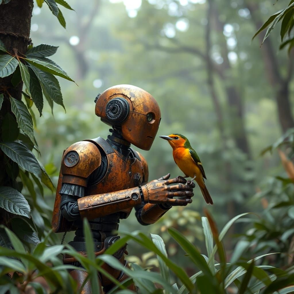 This image shows a cyborg in a lush jungle setting, gently holding a small bird and gazing at it with a mix of wonder and affection, captured in a unique blend of industrial and natural elements.