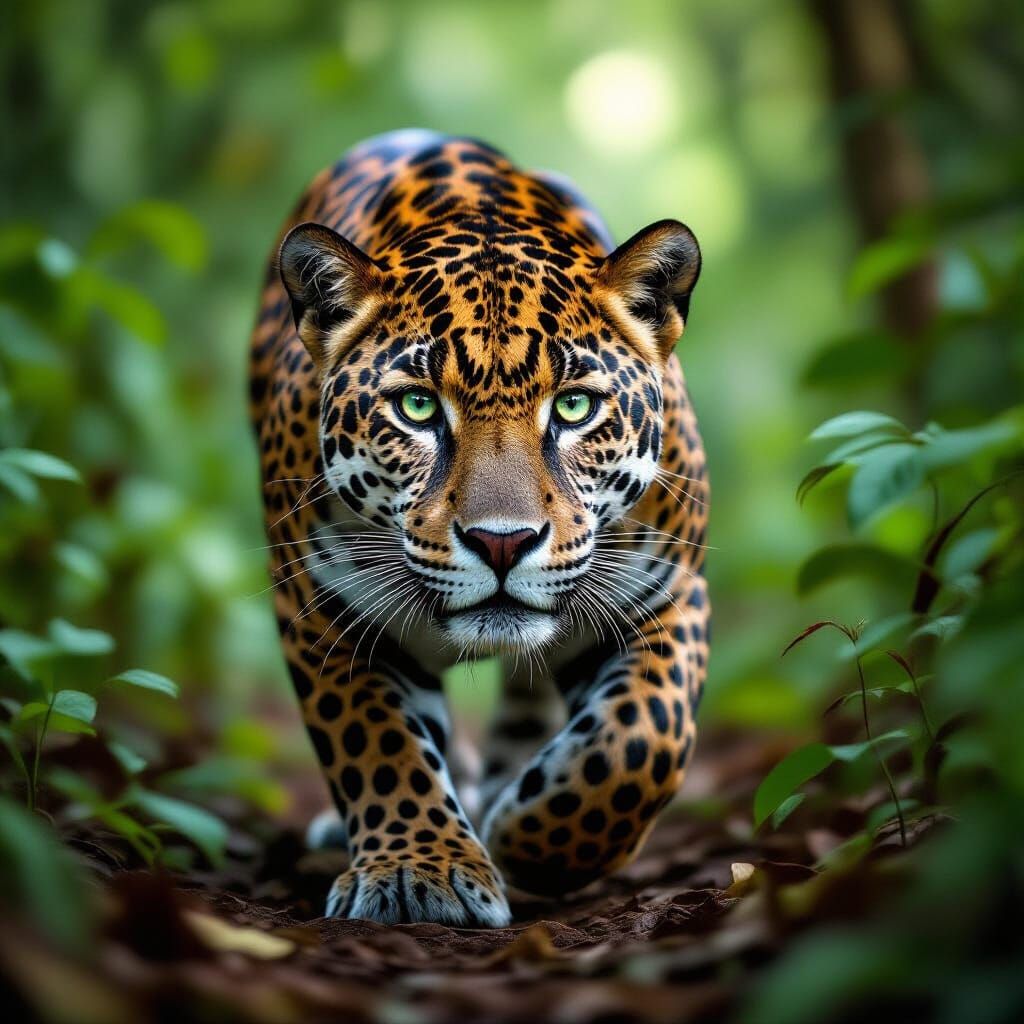 This image shows a solitary jaguar moving stealthily through the dense Chiapas jungle. Captured with a focus on authentic moments and natural details, in the style of a National Geographic photograph.