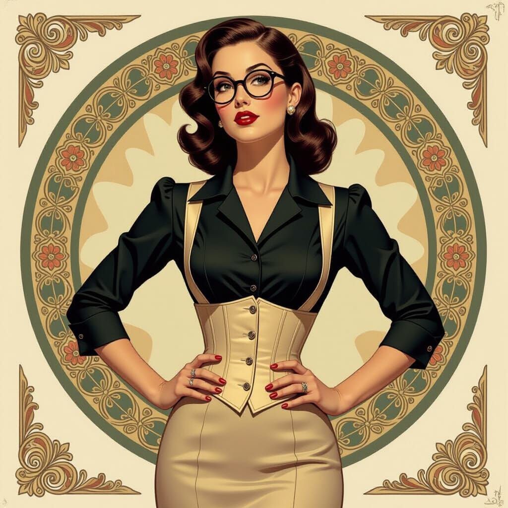 This image shows a 1950s-style office worker in a corset and pencil skirt, rendered with the soft lighting and intricate details of an elegant oil painting.
