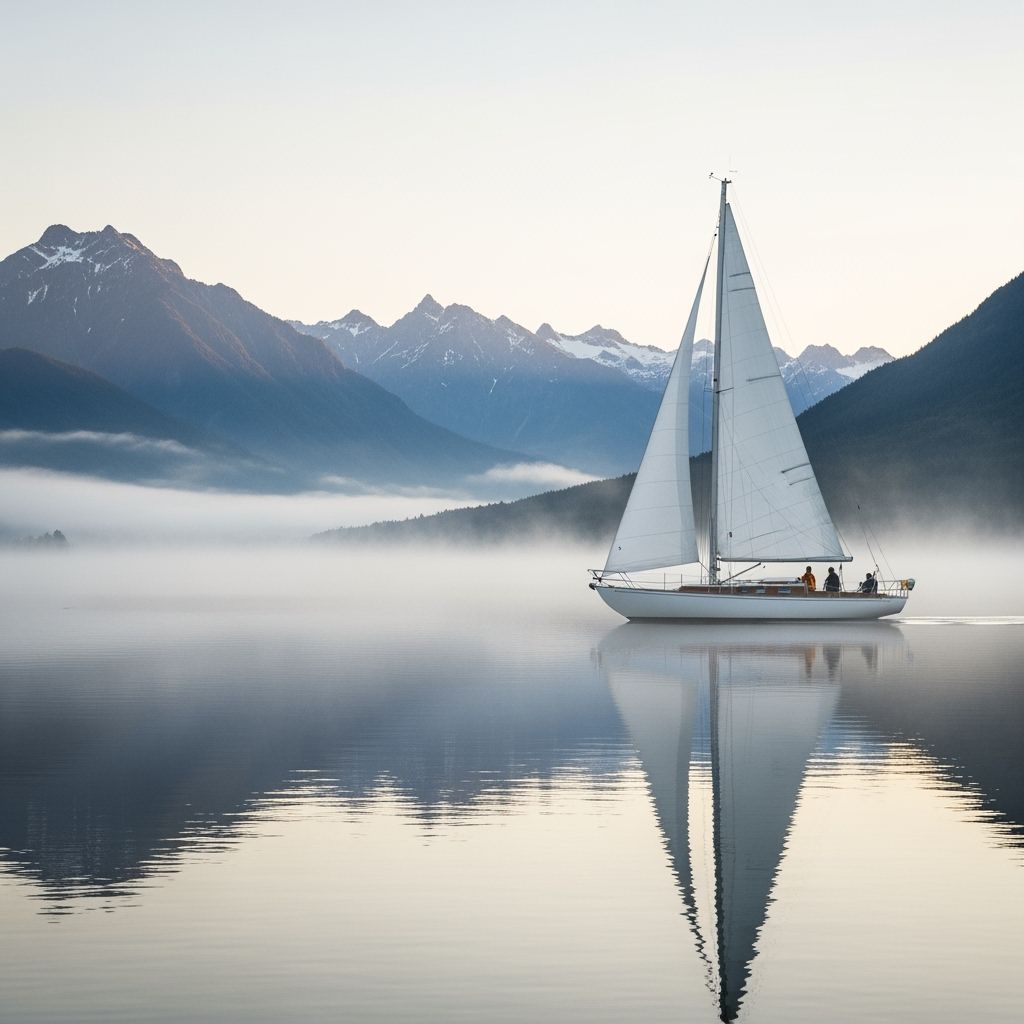 This image shows a lone sailboat on a misty lake at dawn. Majestic mountains surround the tranquil water, captured in hyperrealistic detail with soft colors and shallow depth of field.