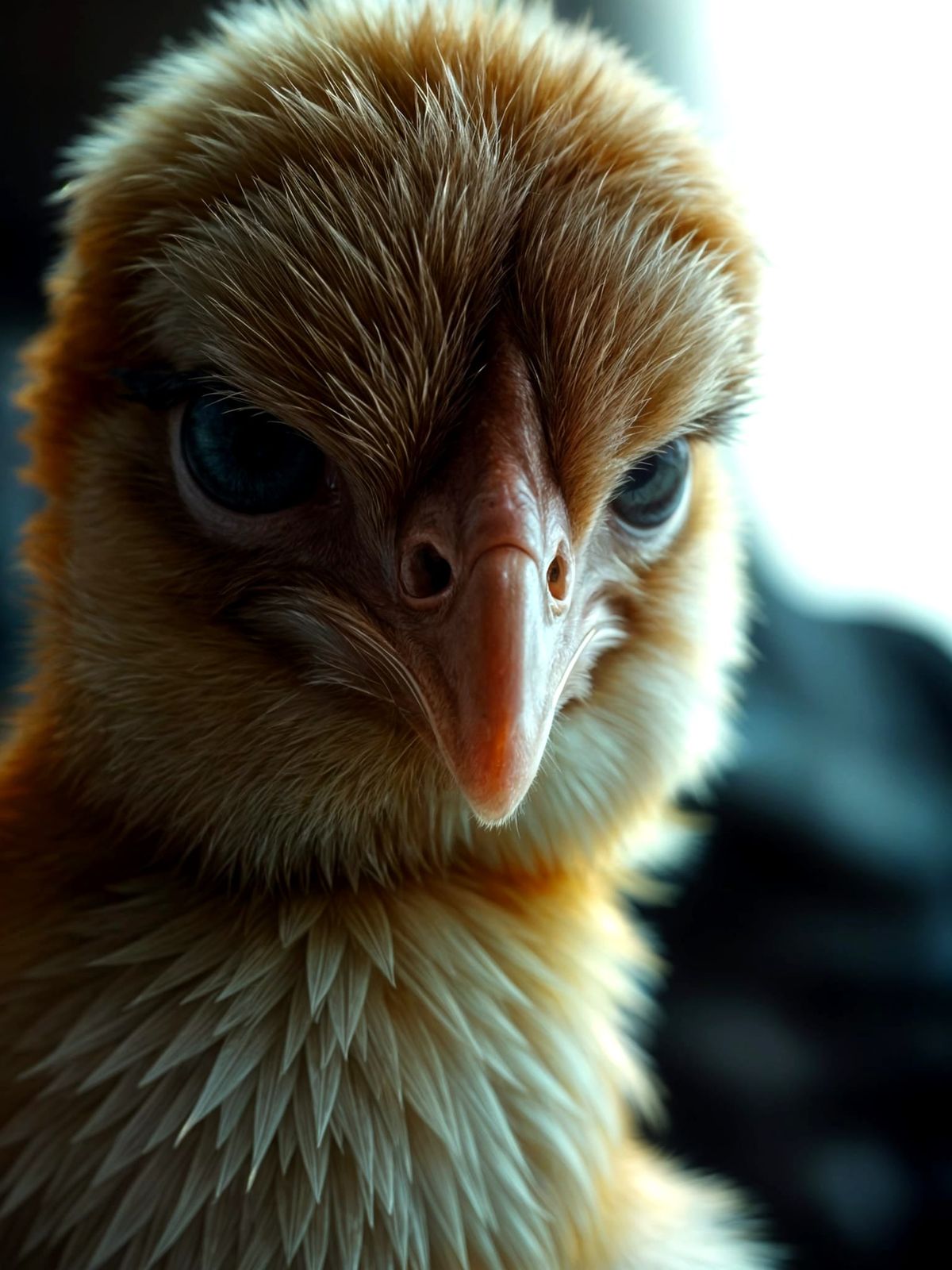 This image shows a grumpy chick. It's a cinematic still with film grain and atmospheric lighting, reminiscent of live-action film.