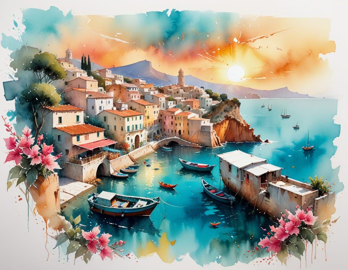 This image shows a warm sunrise over Civitavecchia, with fishing boats in a turquoise bay and terracotta rooftops. Rendered in a stylized watercolor aesthetic with splashy white space.