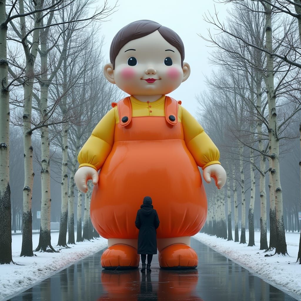 A surreal and dreamlike scene of a massive, 20-foot-tall inflatable doll in a deserted urban park, surrounded by snow-covered trees and a lone figure, evoking a sense of unease and melancholy, with a reflective, wet pavement and rainy mist adding to the uncanny atmosphere, capturing the essence of contem...