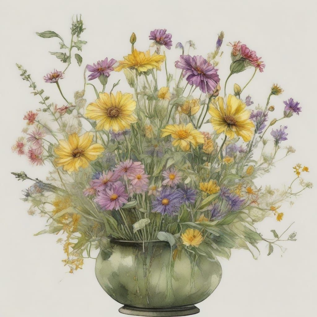 This intricate watercolor and ink line art features a beautiful arrangement of wildflowers in a large olive green vase, showcasing delicate and detailed brushstrokes and bold drawing lines, reminiscent of traditional watercolor techniques.