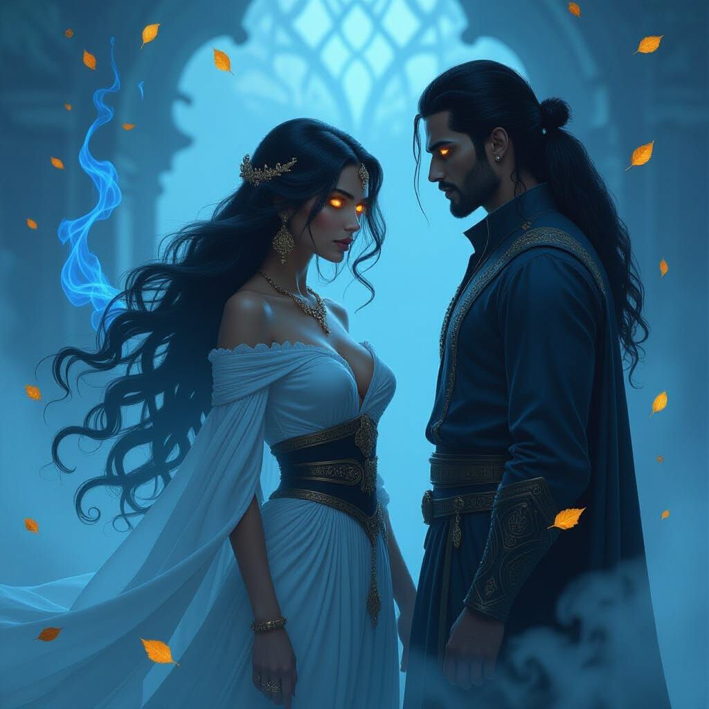 A captivating image shows a beautiful genie woman observing a man from afar. The scene is set with dramatic lighting, surreal elements, and fantasy realism, featuring blue flames and dissolving golden leaves.