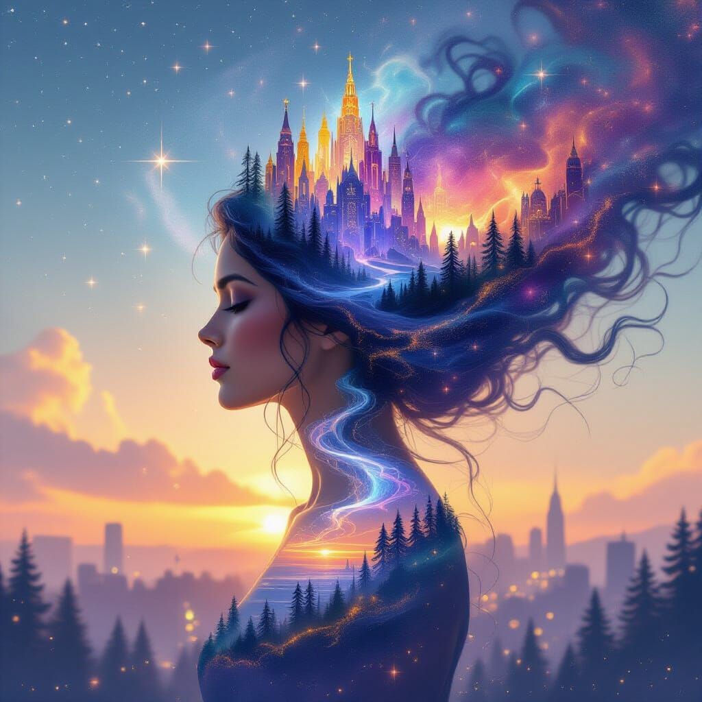 This image shows a woman's silhouette filled with vibrant cosmic imagery. Forests, rivers, sunsets, and city lights blend within her profile, crowned by stars and crystal palaces in a dreamlike, ethereal style.