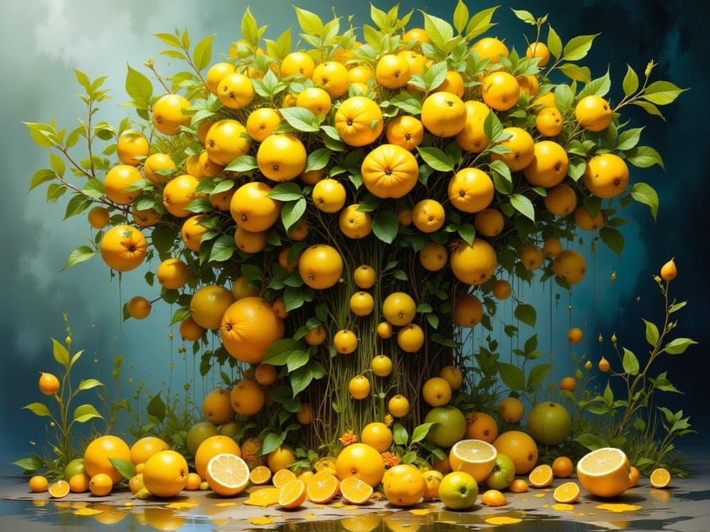 This hyperdetailed concept art showcases a vibrant lemon tree with dynamic and volumetric lighting. Rendered in Unreal Engine 5, it features triadic colors and intricate detail, trending on Artstation.