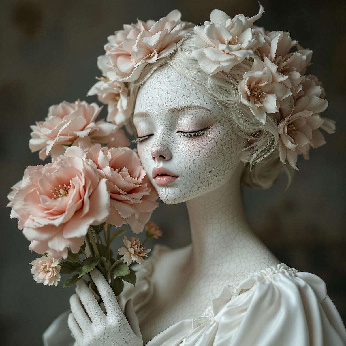 This image depicts a delicate porcelain figurine with intricate cracks, her eyes closed, wearing a flowing white gown and holding a bouquet of soft pink flowers, blending elegant realism with subtle surrealism.
