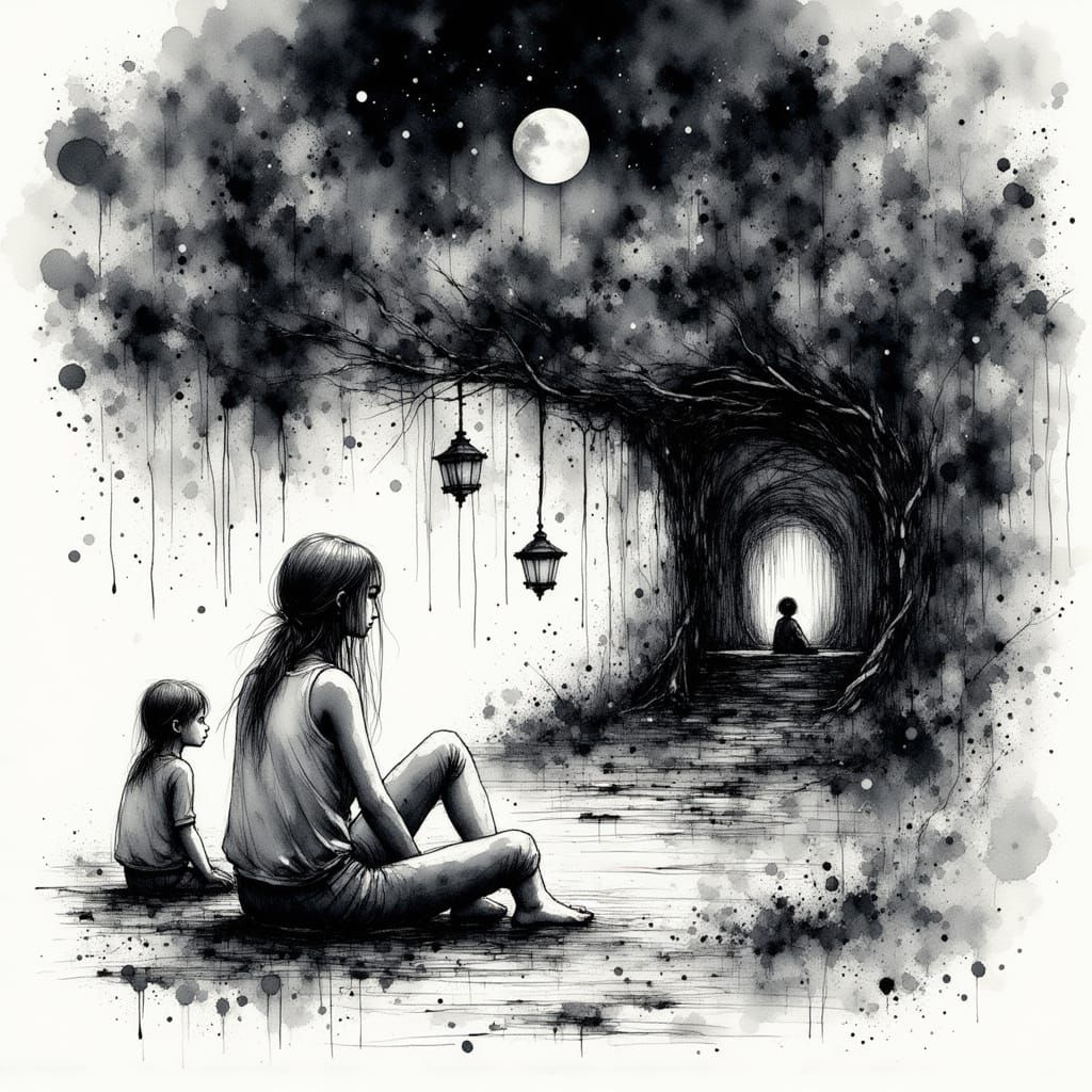 This black and white drawing shows a woman sitting by a window, crying heavily as rain pours down outside at night. The image evokes a somber mood.