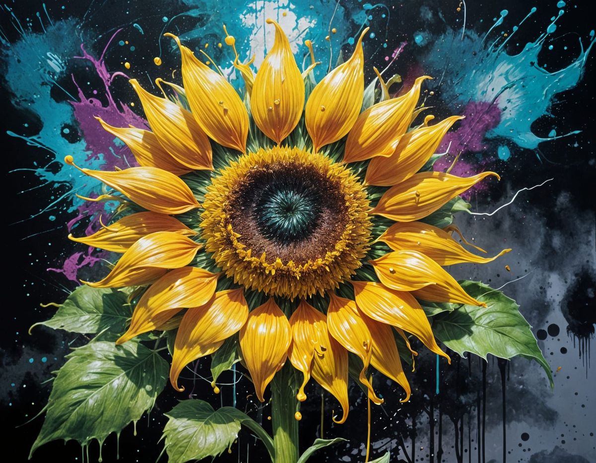 This image features a sunflower with a dynamic electrical storm contained within its center, rendered in a vibrant graffiti and splash art style with high contrast and intricate detail.