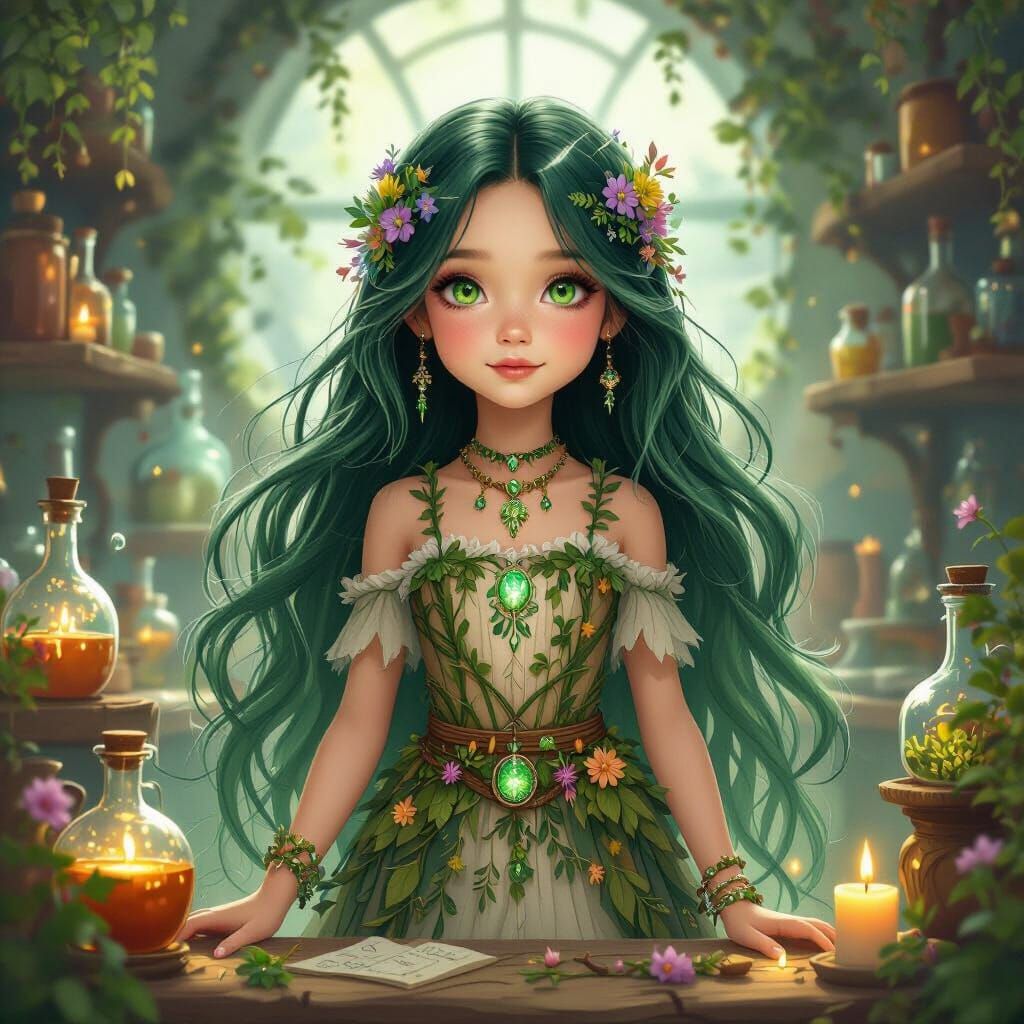 A digital painting shows a girl with green hair and eyes in an apothecary. She wears a gown made of woven plant fibers and is surrounded by potions and herbs. The style is reminiscent of fantasy art.