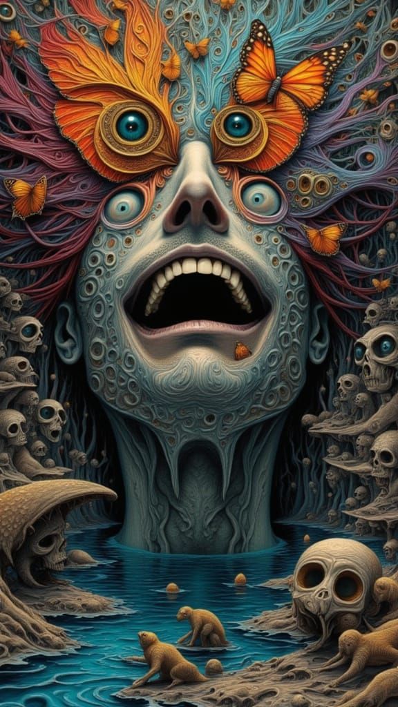 This image showcases a photorealistic portrait of a man partially submerged in liquid metal. His face, composed of intricate natural elements, is reflected on the rippling surface, creating surreal geometric patterns.