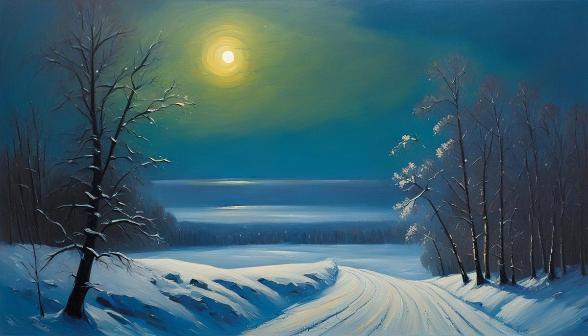 A moonlit winter landscape in the style of an oil painting. The image captures a serene scene rendered with luminous light and detailed textures.