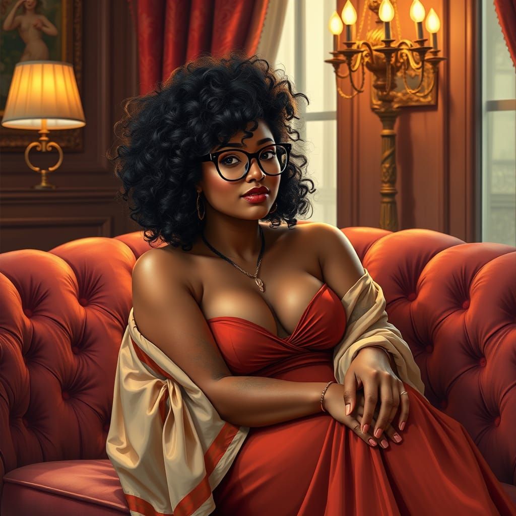 A striking picture of a curvy Indian woman with glasses, seated on a velvet couch. She is wearing elegant attire in a warmly lit room, drawn in an intricate, fantastical art nouveau style.