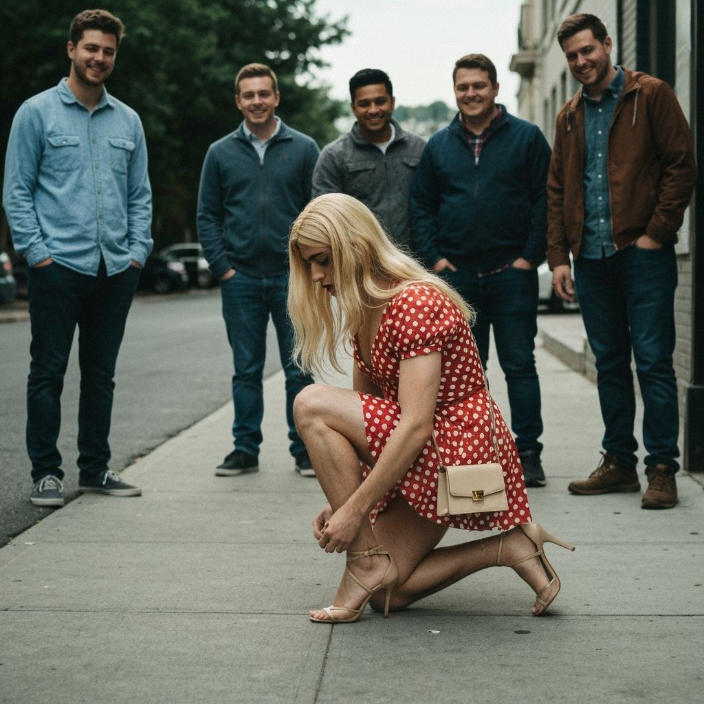A cinematic film still captures a shy young man in a vintage polka dot minidress and heels, lacing his footwear on a sidewalk. Other men observe from behind.