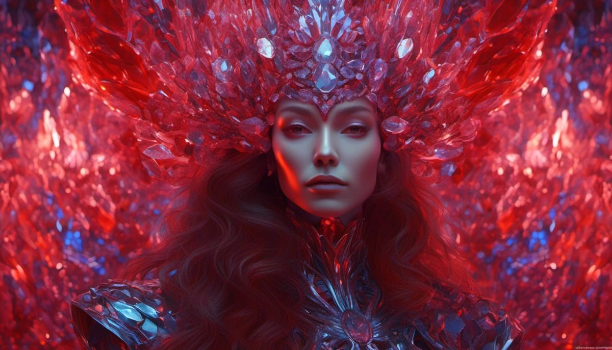 This image shows a portrait of a face made of red crystals. The artwork is reminiscent of Art Nouveau, with mystical and surreal elements, glowing runes, and dynamic lighting.