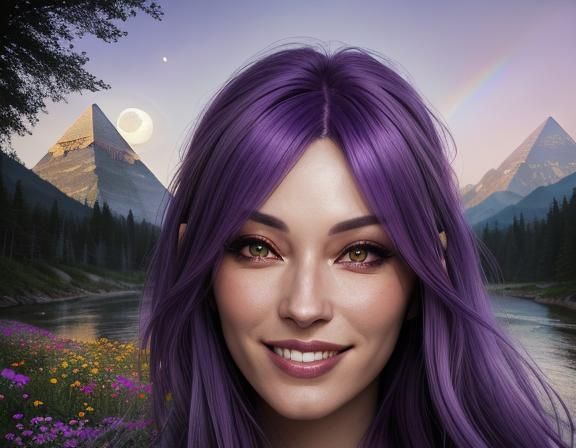 A vibrant close-up portrait of a smiling woman with purple hair, set against a surreal landscape. This digital artwork features auras, rainbows, and pyramids in a colorful, dreamlike style.