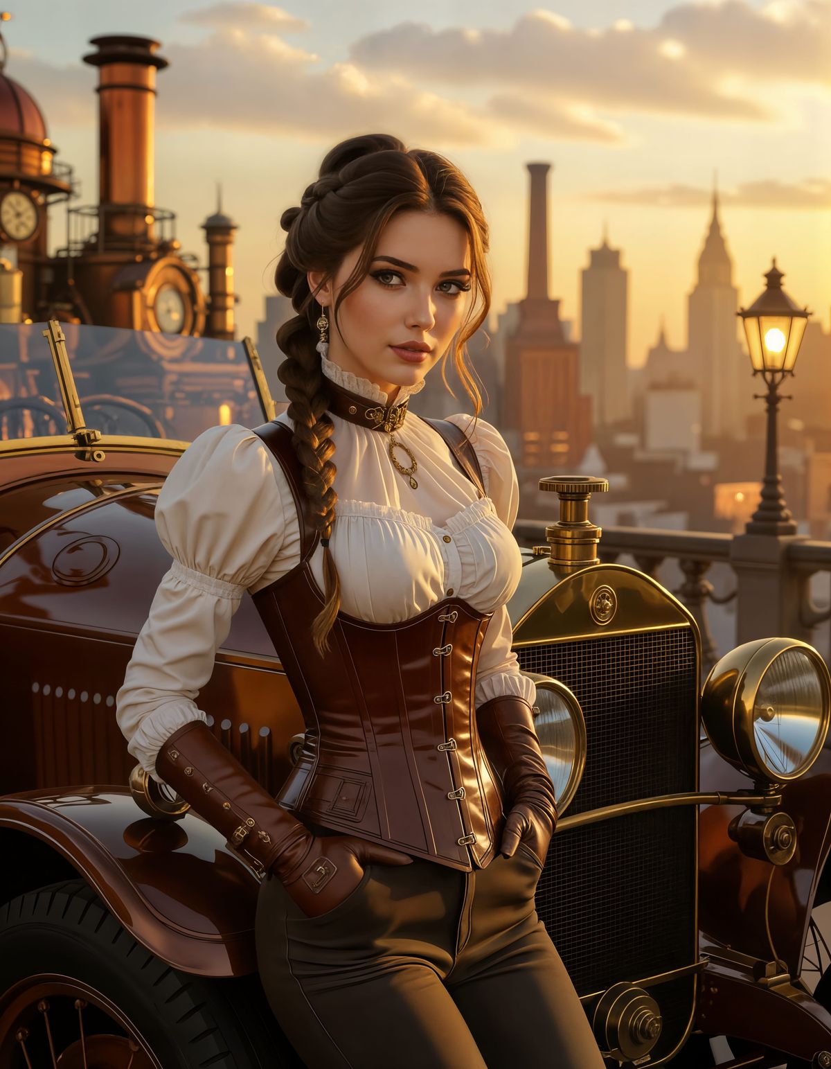 Hyper-realistic digital photograph of a beautiful young woman (around 20–25 years old) in elegant steampunk attire. She leans casually against the front of a large metallic steam-powered car covered in brass pipes, gears and mechanical details. The woman wears a Victorian-industrial style outfit: brown leather corset, high-collared white blouse with puffed sleeves, and fitted trousers. Her hair is styled in an elaborate braided updo with a few loose strands framing her face. Behind her stretches a grand steampunk city skyline with copper rooftops, smokestacks and glowing lamps. Warm sunset light reflects off the metal surfaces, highlighting the intricate brass machinery. Cinematic composition, ultra-detailed textures, dramatic lighting