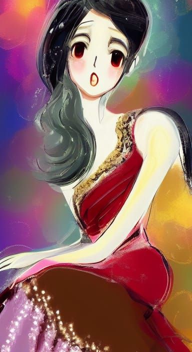 This image shows a happy South Asian woman in profile, in a digital illustration with a wet wash effect. She has long dark hair and wears a couture dress with layered ruffles, in a tonal impressionist style.