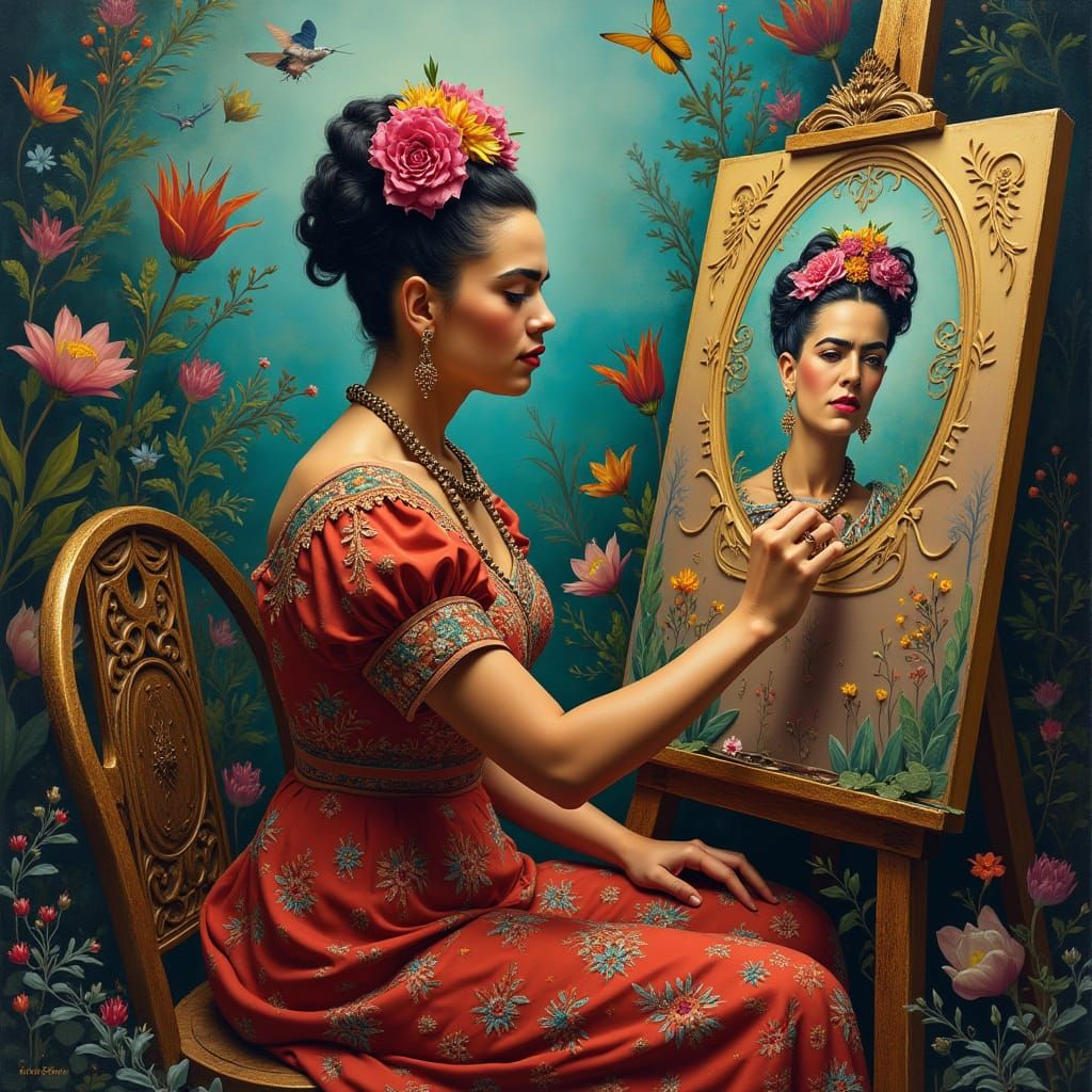 This image shows Frida Kahlo in an otherworldly garden. She is painting a self-portrait surrounded by fantastical creatures and plants, rendered with bold brushstrokes in a surreal style.