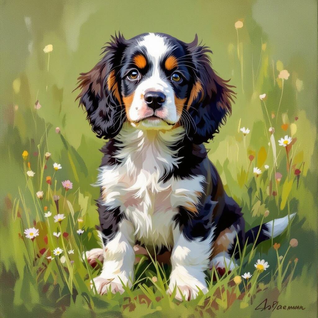 This image shows a Cocker Spaniel sitting in a green meadow. The dog portrait is rendered in an impressionistic style with fluffy ears and soft fur, reminiscent of Monet and Renoir.