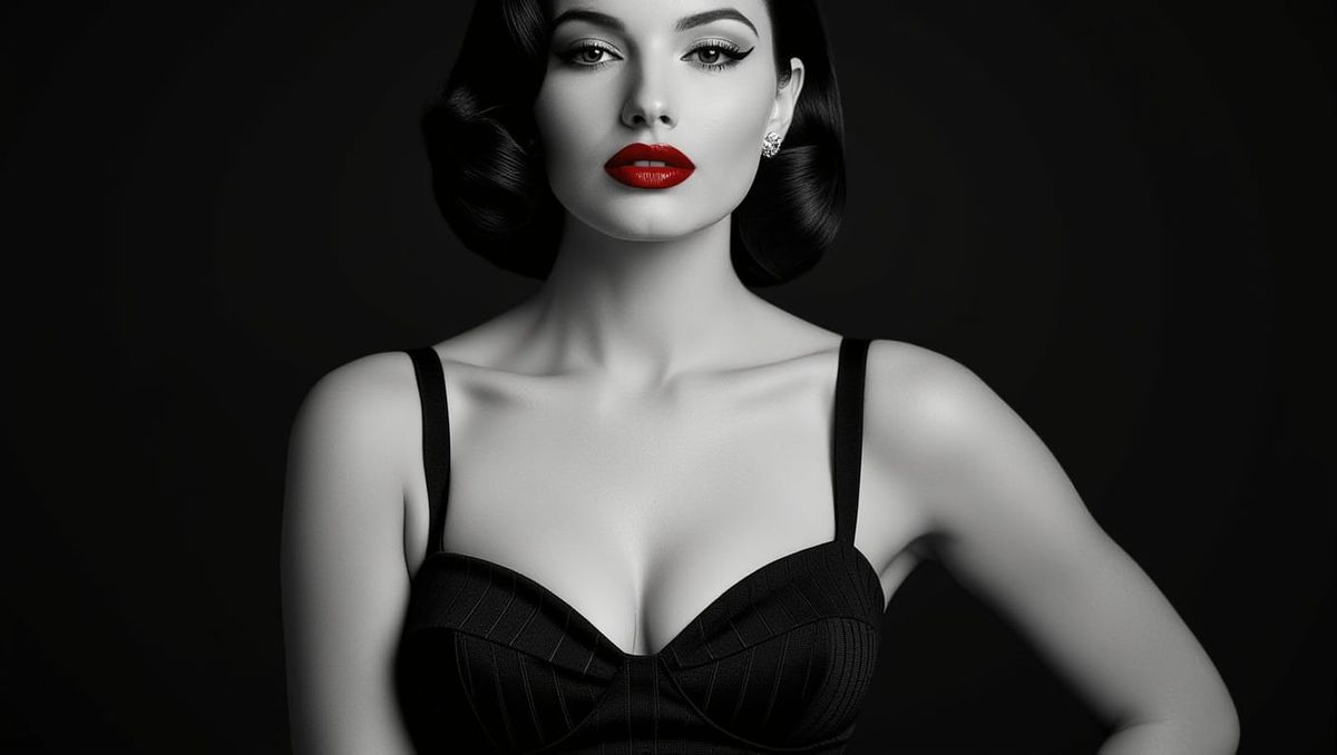 A striking black and white photograph of a woman with a confident gaze and bold red lips, showcasing a classic figure in a short skirt.