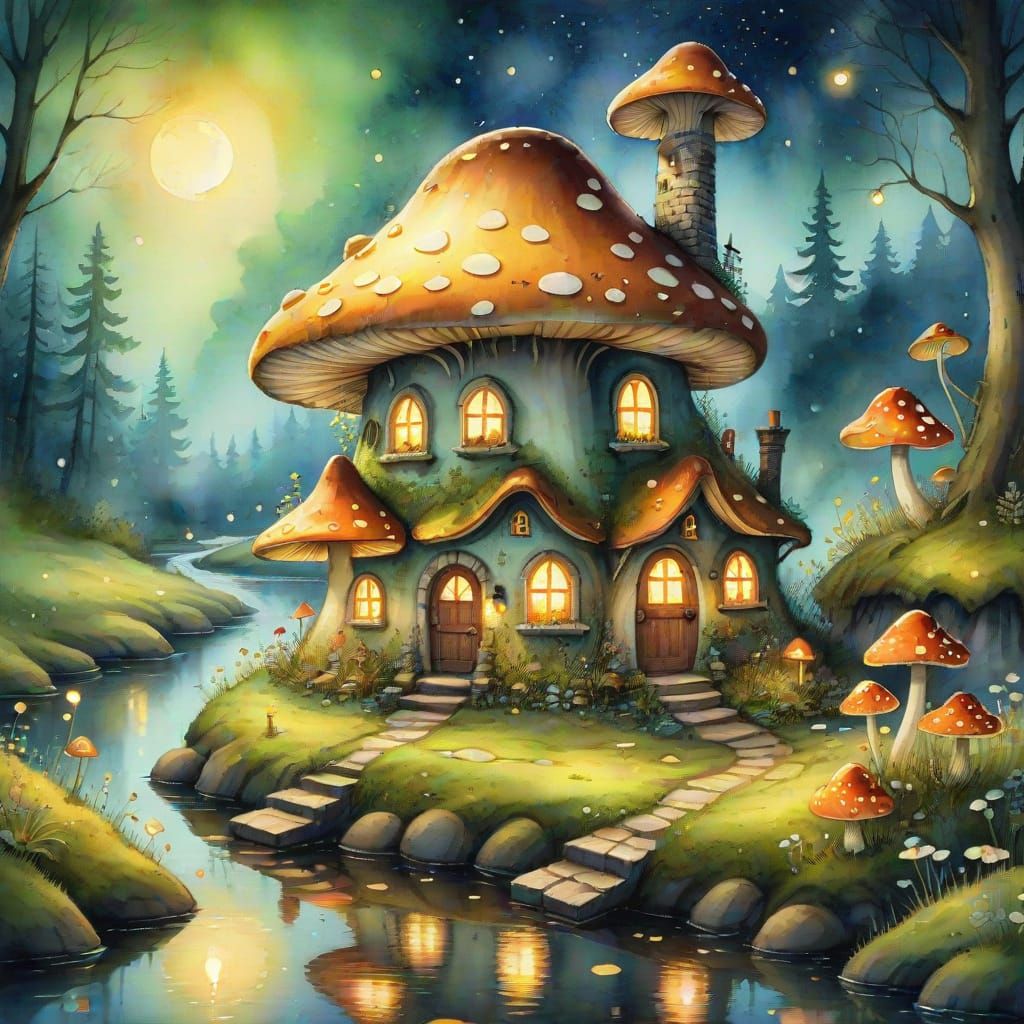 A vibrant watercolor depiction of a fantastical mushroom-shaped house near a serene river, surrounded by twinkling fireflies, soft moss, and warm golden lighting, evoking a dreamy and captivating atmosphere.