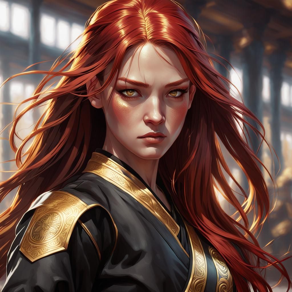 This image shows a portrait of a girl in martial arts clothing. The digital art features dynamic lighting, intricate details, and a hyperdetailed style. It is rendered with volumetric lighting.