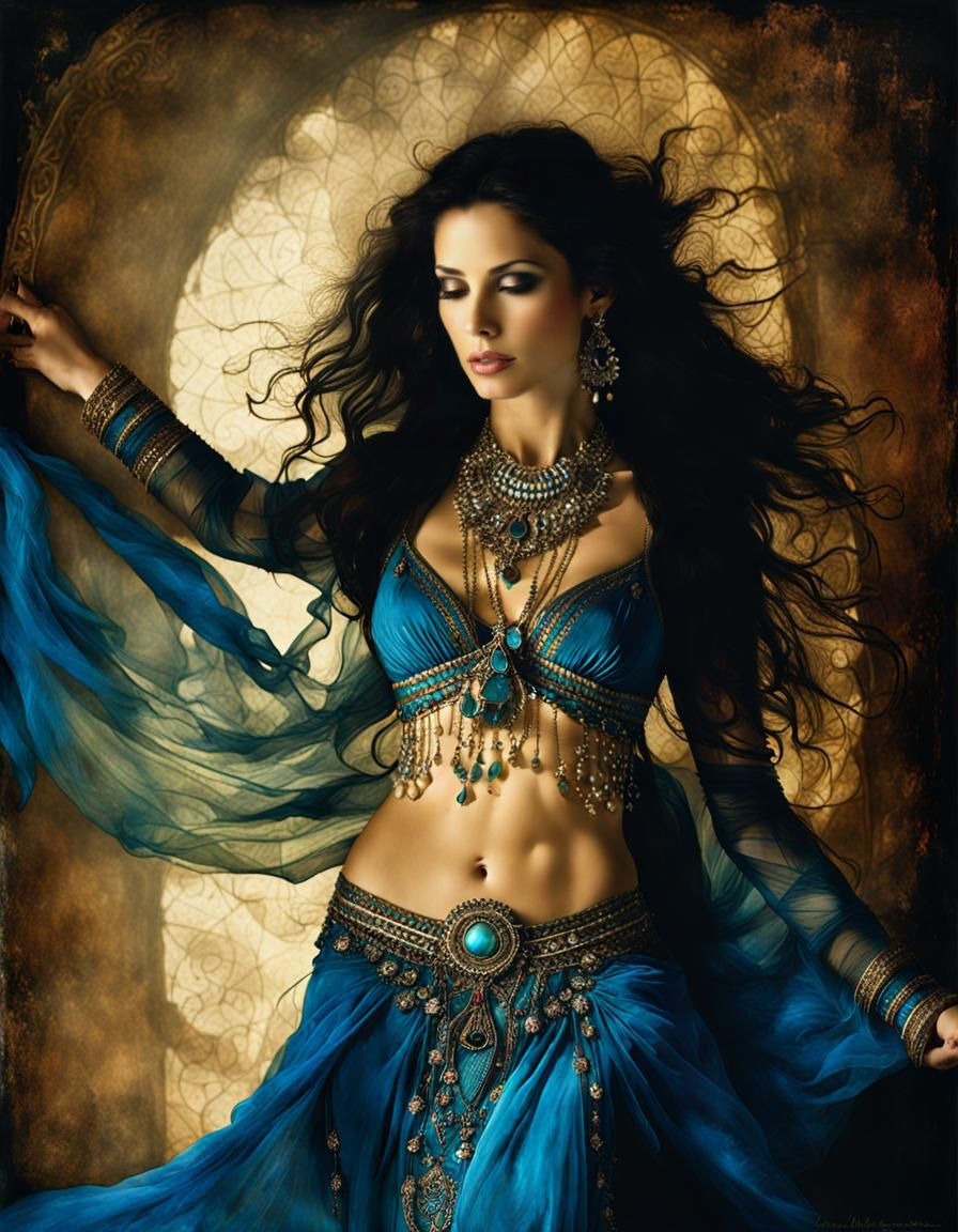 A striking picture of a belly dancer with perfect features and luminous silk clothing, captured in a full color photograph with dramatic colors and dark tones. This image is a hyperrealistic, detailed digital artwork.