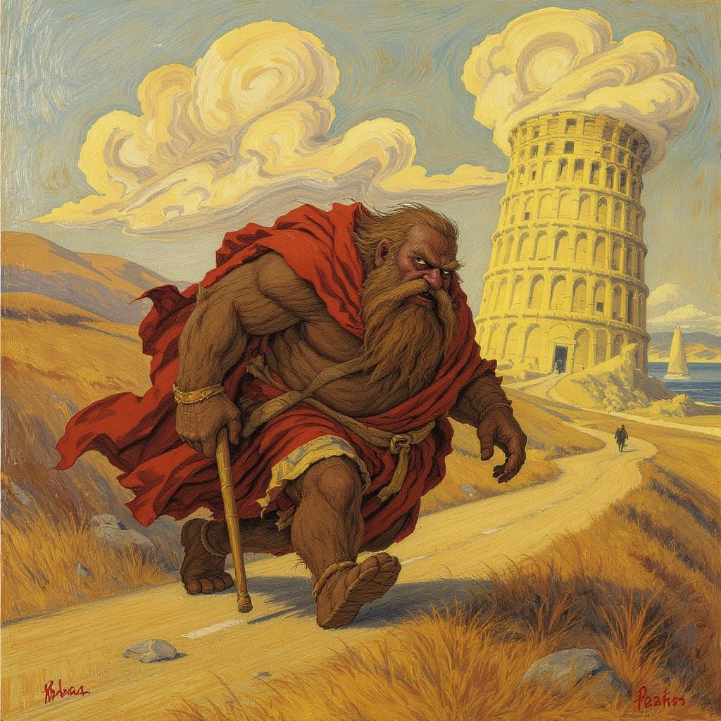 This image shows a large, old goukka walking down a country road, seemingly annoyed by the Tower of Babel sliding down the next lane towards the bay. The artwork is fantastical, whimsical, and in the style of early Netherlandish Renaissance art.