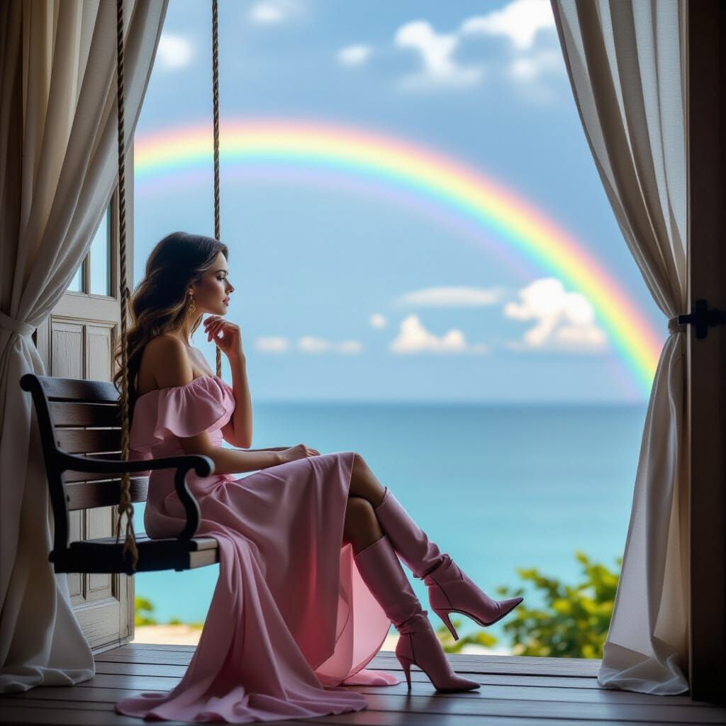 A woman in a pink dress and matching high-heeled boots sits on a swing by an open door, gazing thoughtfully at a rainbow across a tranquil seascape under a cloudy sky.