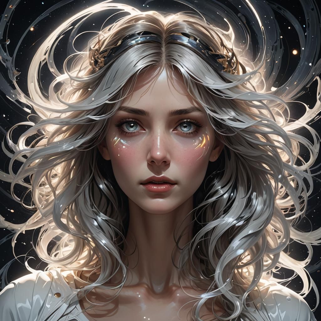 A supermassive black hole emits a beam of light in the darkness of space. This digital portrait features dynamic lighting and intricate details in a triadic color scheme.