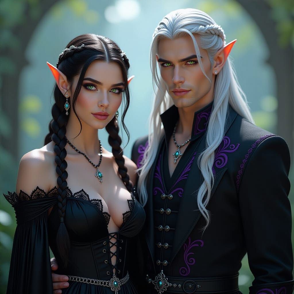 A portrait of an elven couple in complementary attire. The image features hyperdetailed rendering, dynamic lighting and intricate details, with triadic colors and volumetric lighting, in a trending Artstation concept art style.