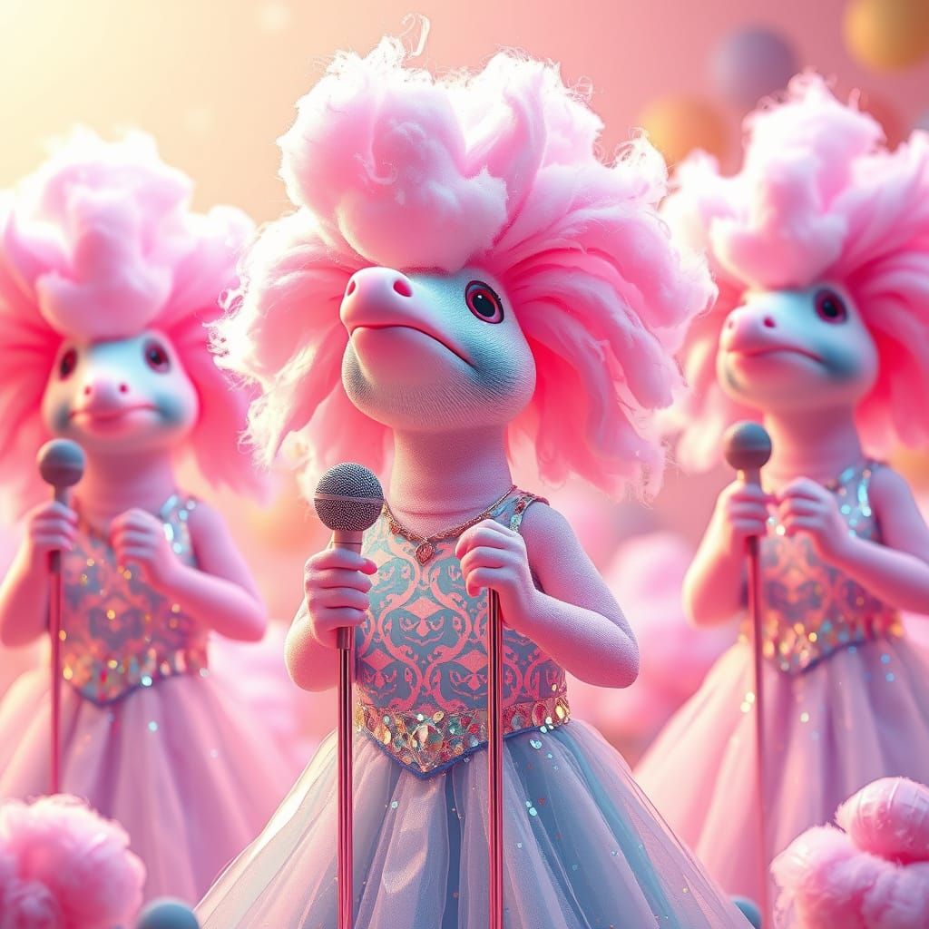 This image shows a whimsical, vibrant girl group of platypuses singing in a candy landscape. They are depicted in a pastel-colored, 3D animation style reminiscent of Pixar, with cotton candy hair and sequined dresses.