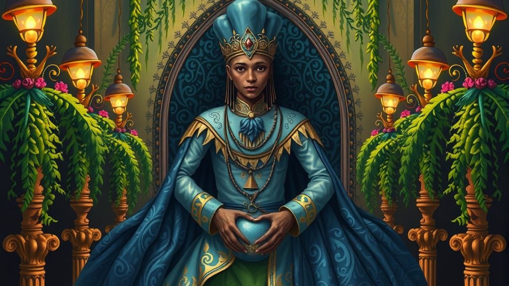 This image shows a voodoo king in ornate robes, set against lush foliage. The artwork is rendered in watercolor and gouache with pointillist details, reminiscent of a 1920s Art Nouveau poster.