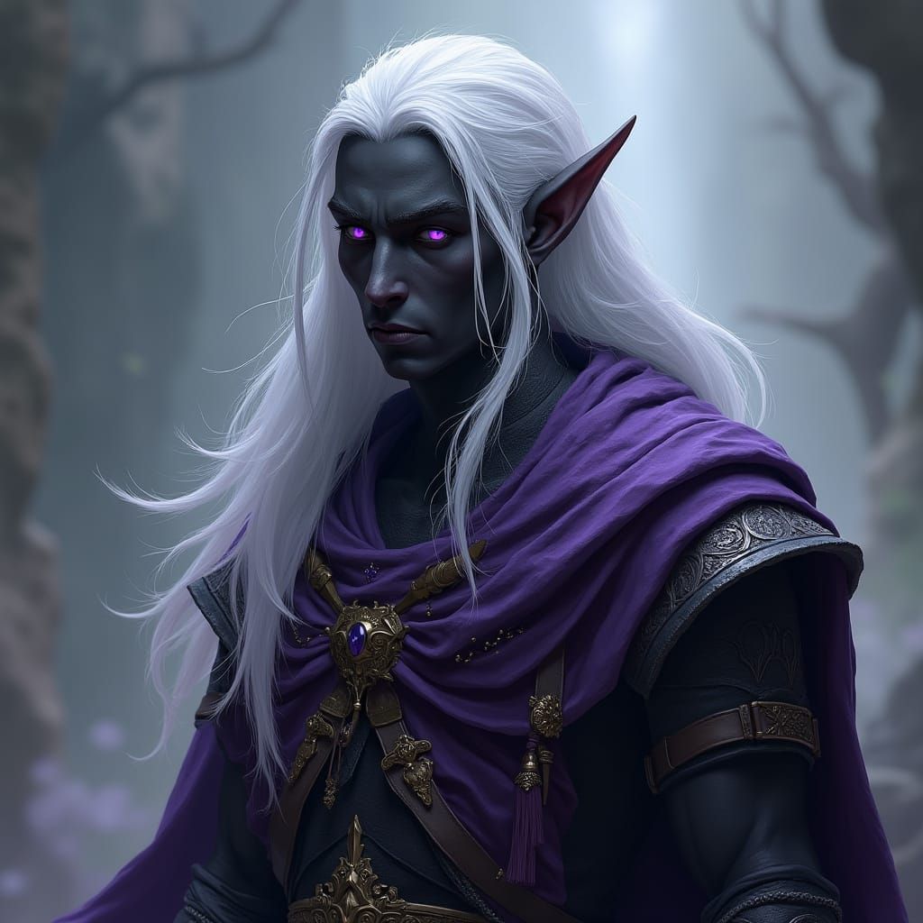 This image depicts a majestic male drow sorcerer with striking features, set against a richly detailed backdrop in a style reminiscent of Simon Stalenhag's atmospheric artwork, with deep colors and intricate details.