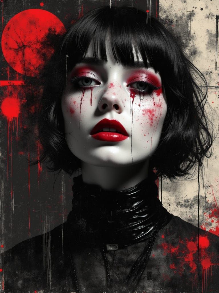 This image features a surreal, moody portrait of a young Gothic woman with an ethereal appearance, rendered in a chaotic, colorful abstract dark aesthetic.