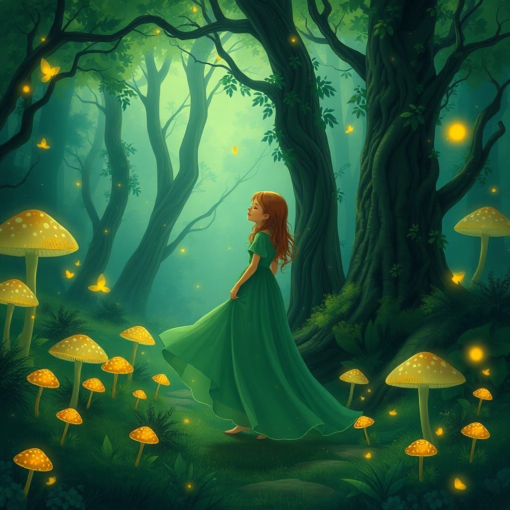 A captivating image of a woman in a green dress in a vibrant forest. The artwork evokes a whimsical atmosphere with intricate details and a soft, ethereal aura, reminiscent of animated fantasy art.