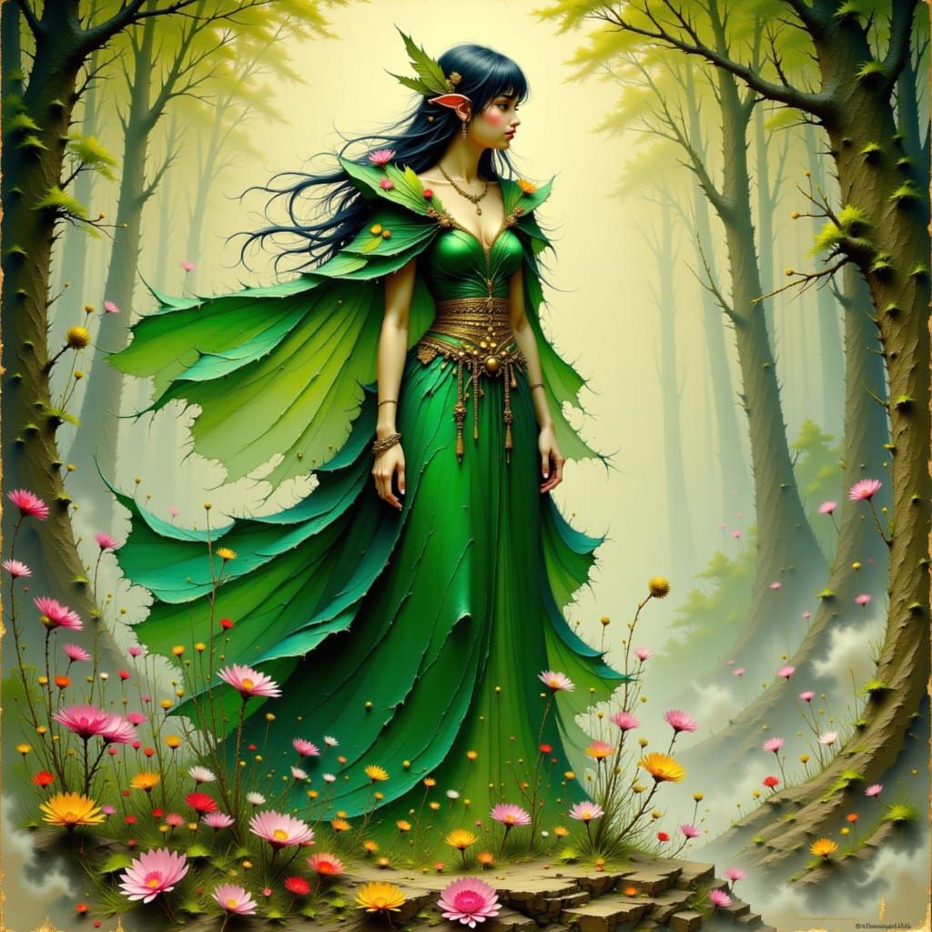 This image shows Brigitte, queen of the Seelie Fae, standing on a flower-covered dias. She is wearing a flowing green gown and a cape of cascading flower blossoms, rendered with intricate and whimsical details in a mystical style.
