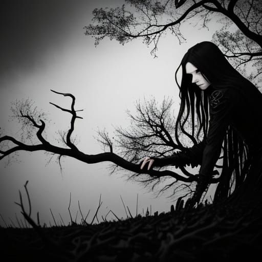 This image shows a solitary goth figure in a desolate field with a cottage and dead tree. The photo conveys a heavy metal aesthetic with elements of abstract expressionism, using moody monochrome lighting and high contrast to create a cinematic, dark romantic feel.
